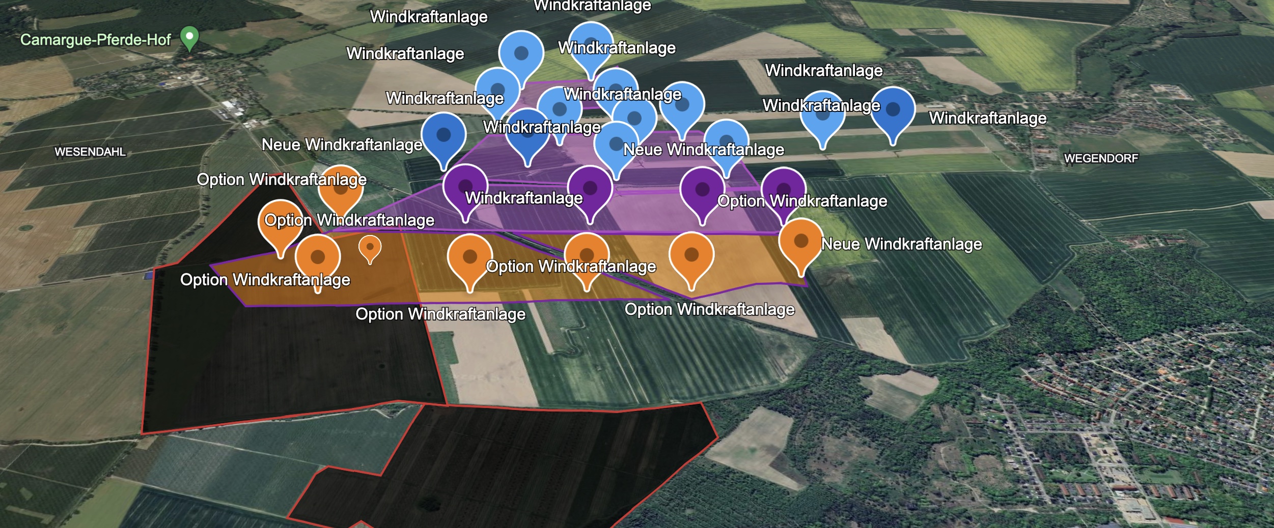 Schattenwurf: Auf Grund der geplanten außerordentlichen Höhe hätten die Anlagen neben der optischen Sichtbarkeit einen extremen Schattenwurf. Diesen empfinden wir dahingehend problematisch, da es sich nicht einfach „nur“ um Schatten, sondern um „bewegten“ Schatten handelt. Von Anwohnern anderer Anlagen wird dies als besonders störend wahrgenommen. Für Anwohner in der Rudolfshöhe, der Rosensiedlung, Wegendorf und Wesendahl wird dies - je nach Tageszeit -vermutlich eine Minderung der Lebensqualität bedeuten.